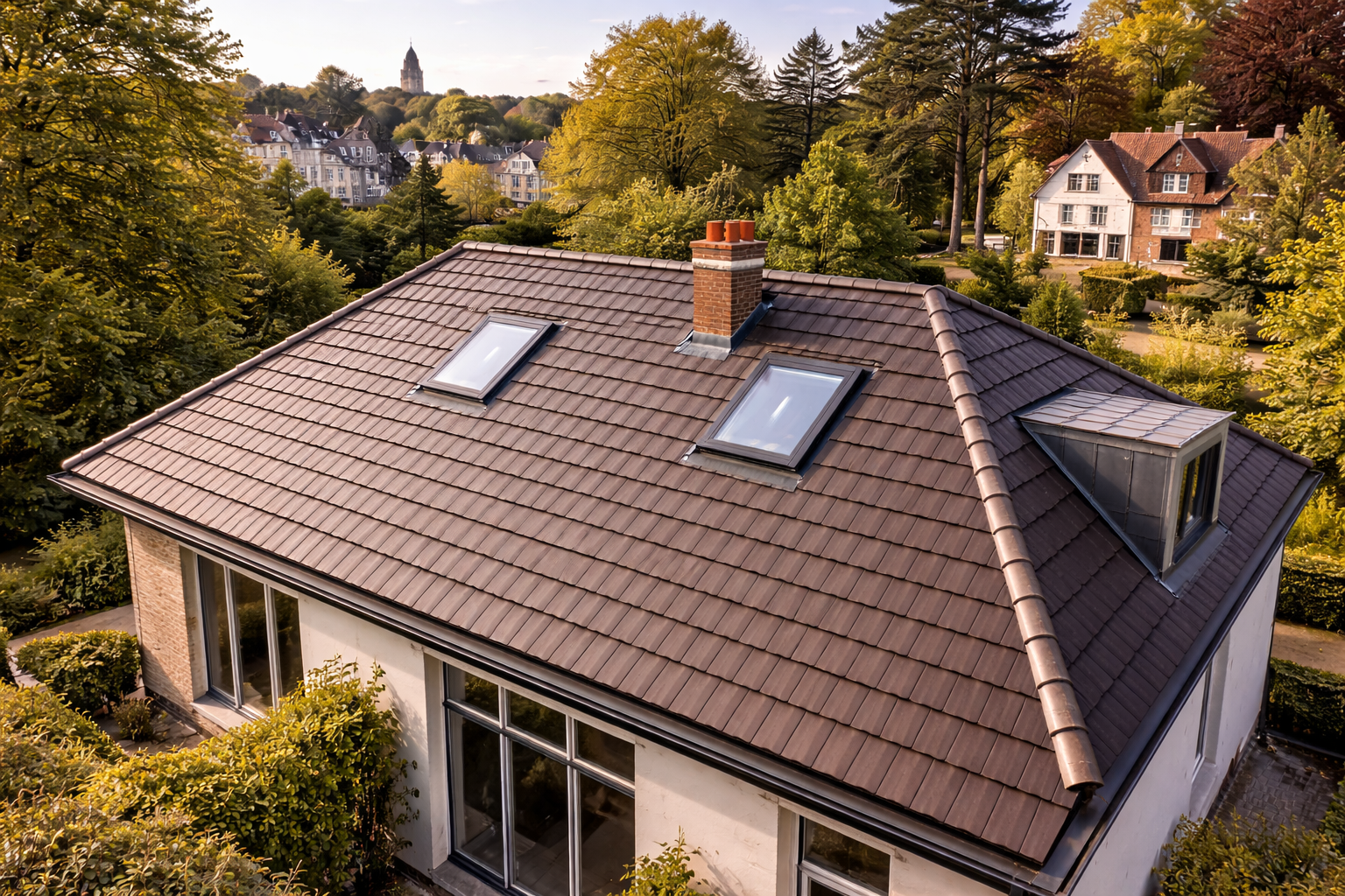 Les maisons de ville bruxelloises sont souvent dotées de toitures inclinées, recouvertes de tuiles ou d’ardoises. Ces toitures présentent généralement une surface plus réduite mais comportent de nombreux éléments techniques : cheminées, lucarnes, fenêtres de toit ou encore gouttières étroites.